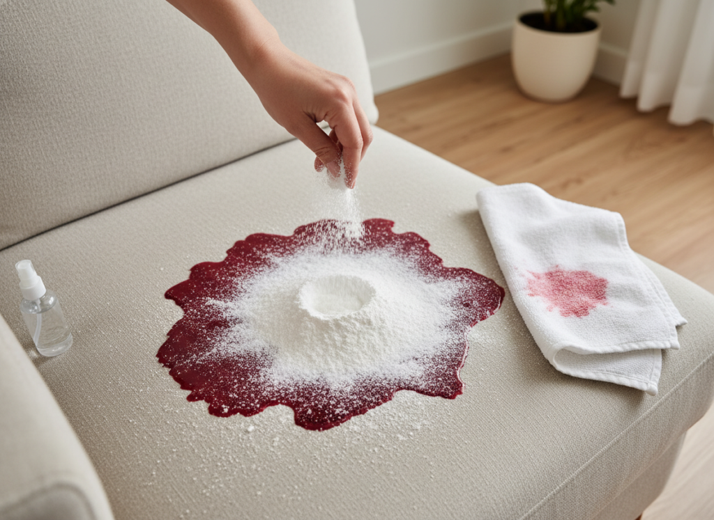 • Salt or baking soda: If the stain is fresh, sprinkle salt or baking soda on the stain to absorb the liquid. Then, rinse with cold water.