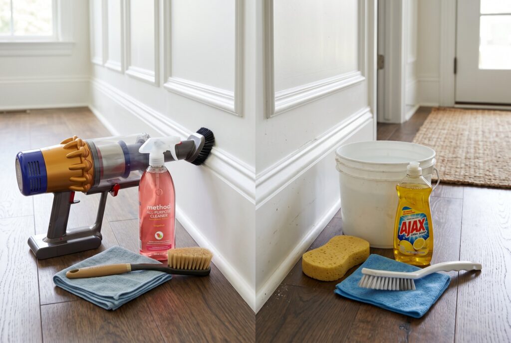 Dry before wet: Attempting to use a liquid baseboard cleaner on thick dust creates a muddy residue that is difficult to remove from crevices.