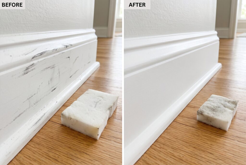 For white-painted trim and baseboards, a melamine sponge remains the gold standard for restoration. This material functions as an ultra-fine abrasive that physically lifts the pigment of the scuff away from the paint. Moistening the sponge before use is vital to activate the microscopic cleaning structures.