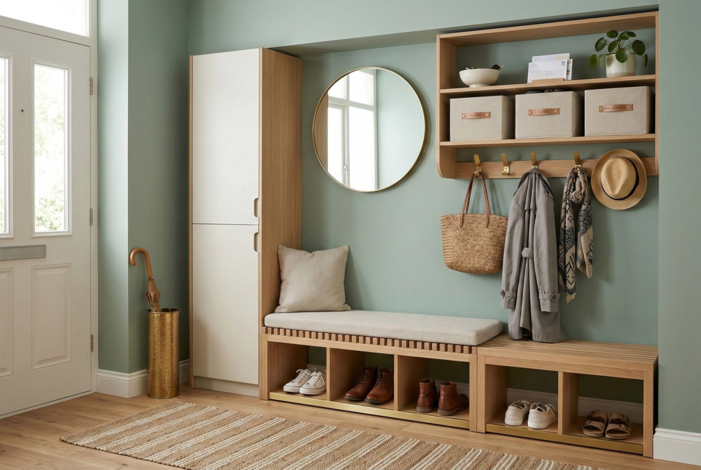 Look for storage solutions that can double up, like a shoe rack with built-in seating or a narrow bench with hidden storage. These items help you keep everything organized while maintaining a clean, open entryway.