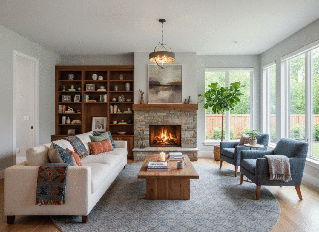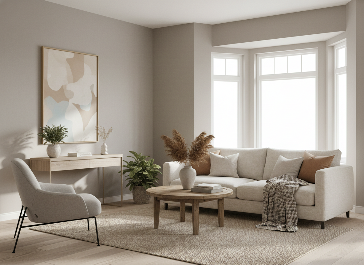 In the living room, add warmth with a softly draped throw blanket, keep décor simple and thoughtfully arranged, and make sure surfaces stay tidy. Seating should feel inviting and comfortable without overcrowding the space, allowing the room to feel open and easy to enjoy.