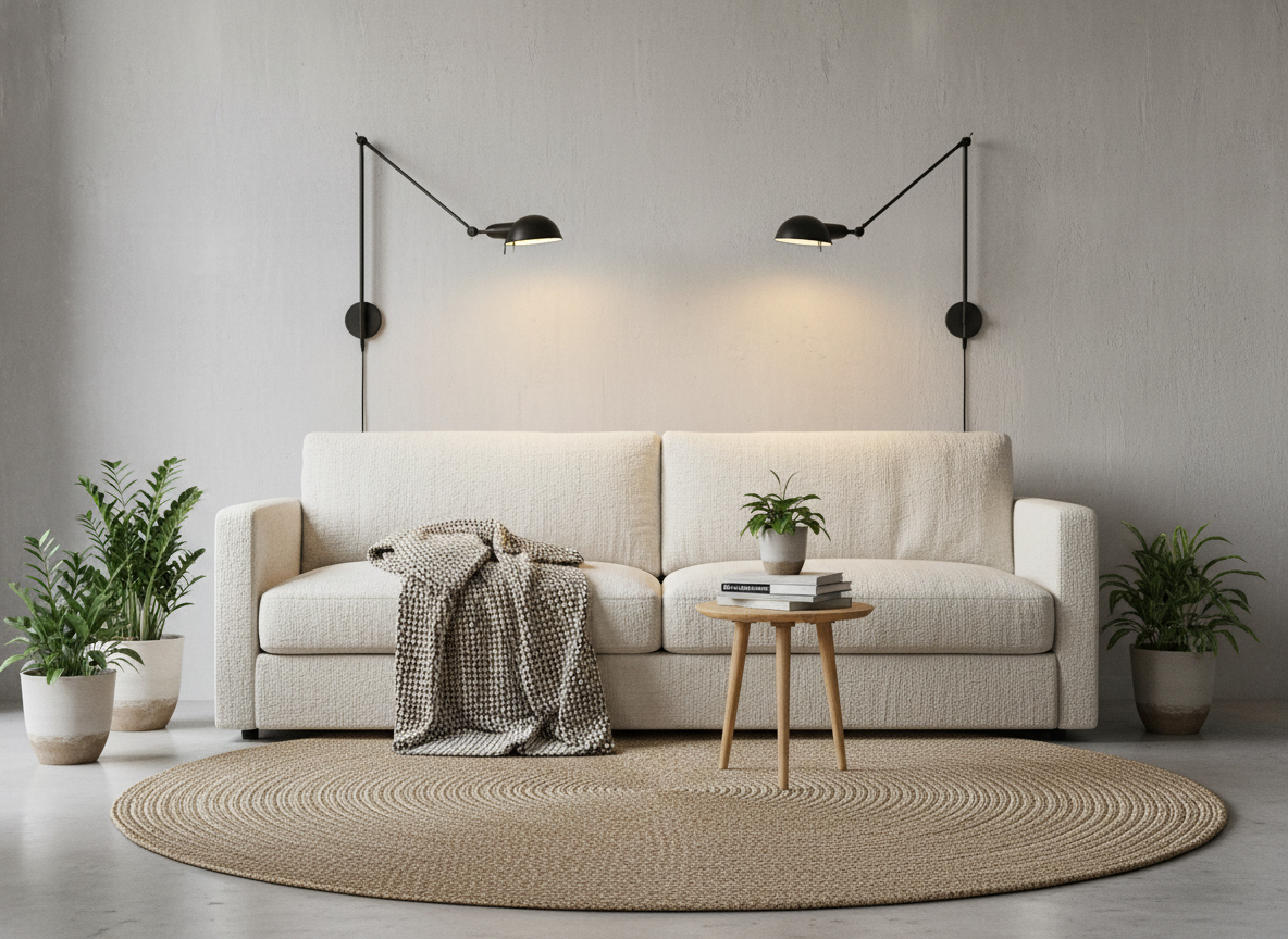 Wall lighting introduces depth, creating layers that make a space feel more intentional and inviting. Then, you can consider some minimalist-friendly choices like simple globe sconces, slim swing-arm reading lights, or integrated LED wall bars. When the light is soft and indirect, the entire room feels calmer, warmer, and noticeably more complete.