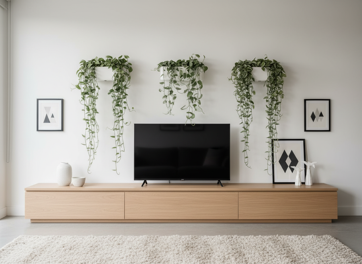 Biophilic design pairs naturally with minimalism when it’s applied with restraint. Simple, wall-friendly touches like pressed leaves framed between glass, wall-mounted planters with trailing greenery, or a single sculptural branch displayed horizontally bring in an organic element. These subtle references to nature soften clean lines and neutral palettes, adding warmth and life while preserving a calm, uncluttered look.