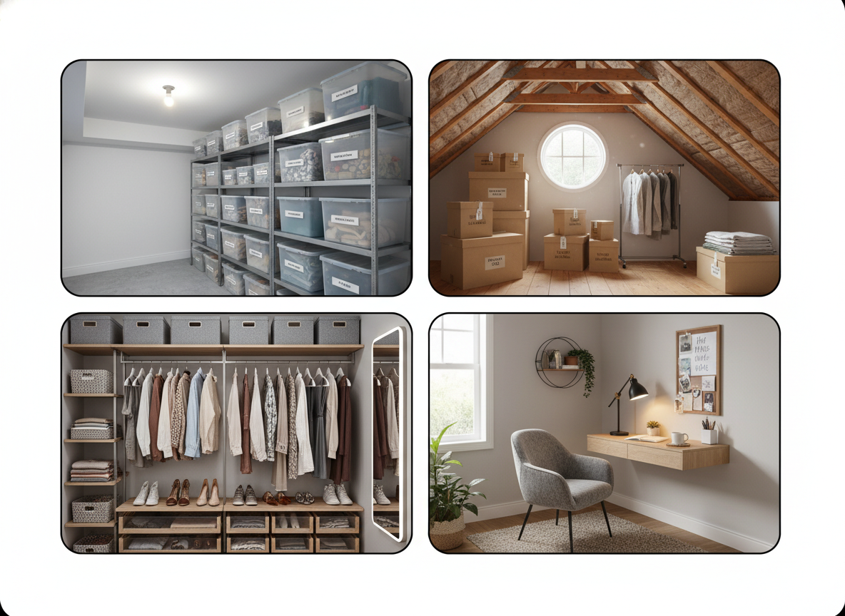 For basements, you can change them into game rooms, offices, or spaces for guests. In terms of attics, turning these into small bedrooms, quiet reading spots, or cozy hideaways is a good idea. And for those who work from home, they can take advantage of closets to become tiny home offices. Also you can use unused corners to make room for shelves, desks, or extra storage.