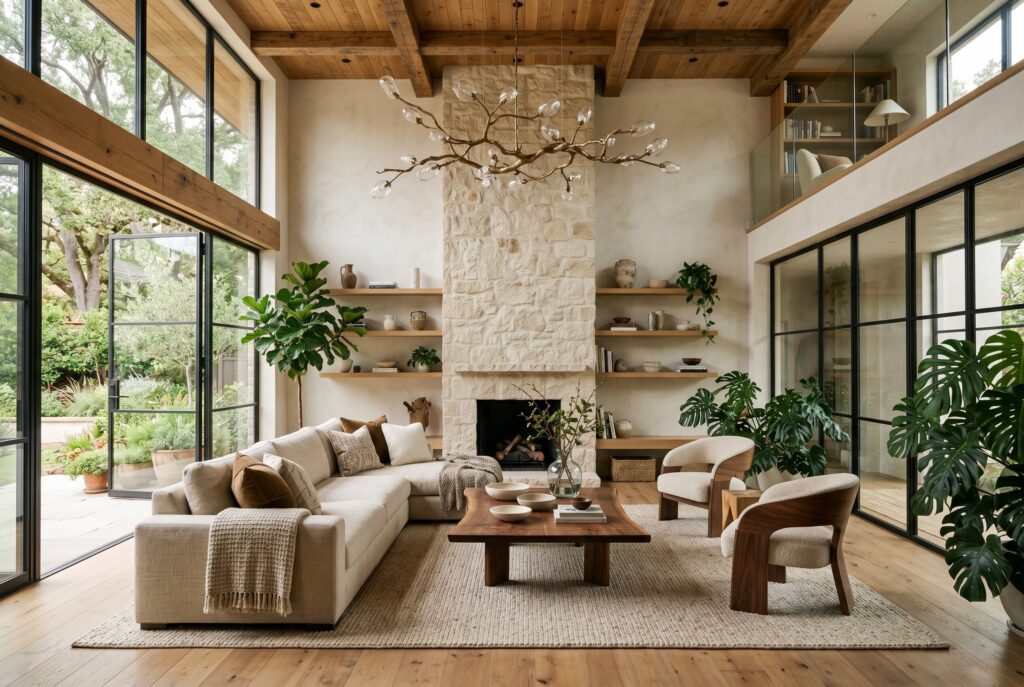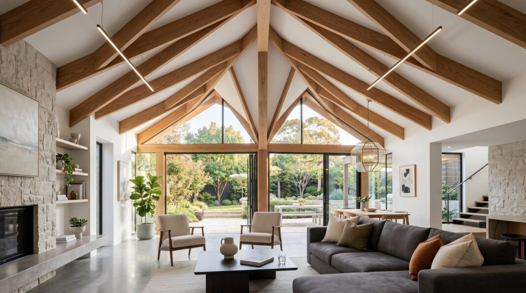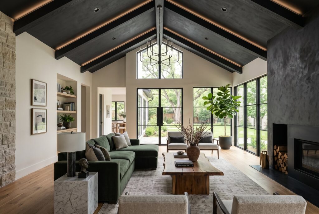 Exposed wood elements: The modern farmhouse look remains strong, but there is a shift toward reclaimed, natural wood beams that add warmth and history to high spaces.
