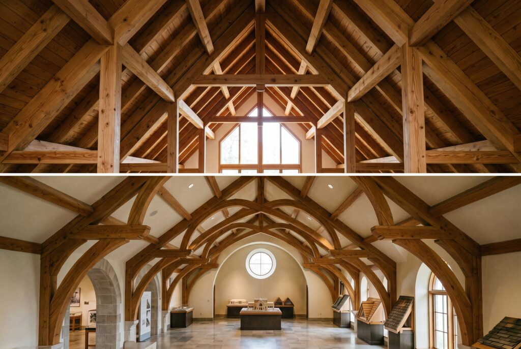 To create the height of a vaulted ceiling without compromising the integrity of the roof, builders often use scissor trusses. These provide the necessary support while allowing the ceiling to slope upward at a different angle than the exterior roof line. This technical detail is vital for maintaining the structural stability of the home.
