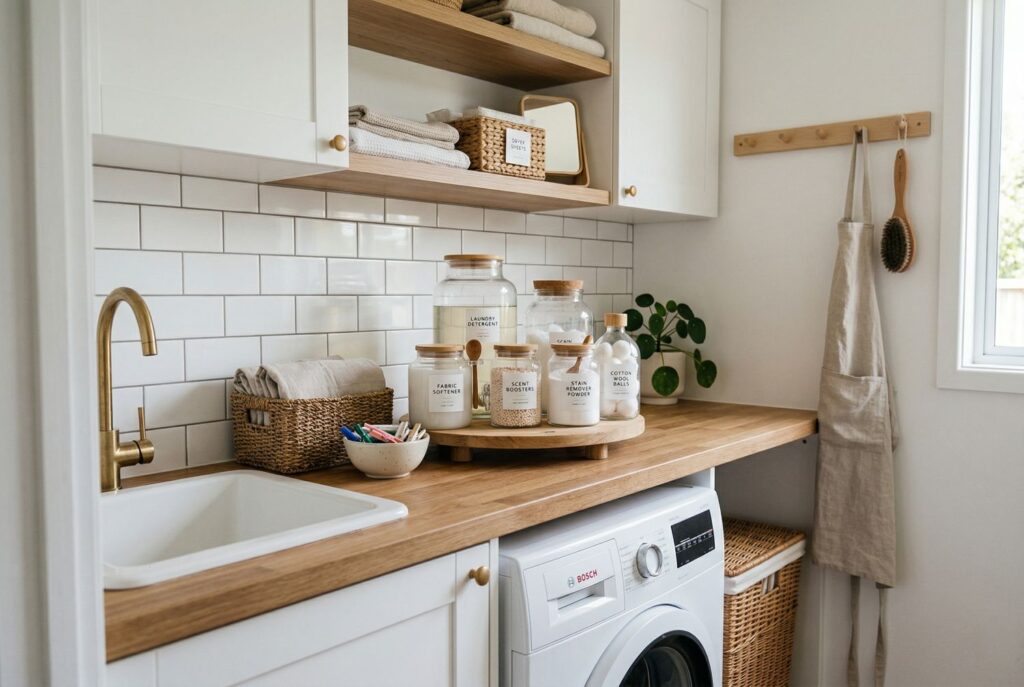 Sometimes the mess isn’t about quantity. It’s about packaging. Bright bottles, half-used boxes, and mismatched containers create visual clutter fast. Decanting laundry supplies into glass jars, labeled dispensers, or matching bins is one of the easiest laundry room organization tricks you can use. It solves the problem of the room looking chaotic even when it’s technically tidy. You can store pods, clothespins, dryer sheets, or powdered detergent in a more consistent way, and the whole room immediately feels calmer.