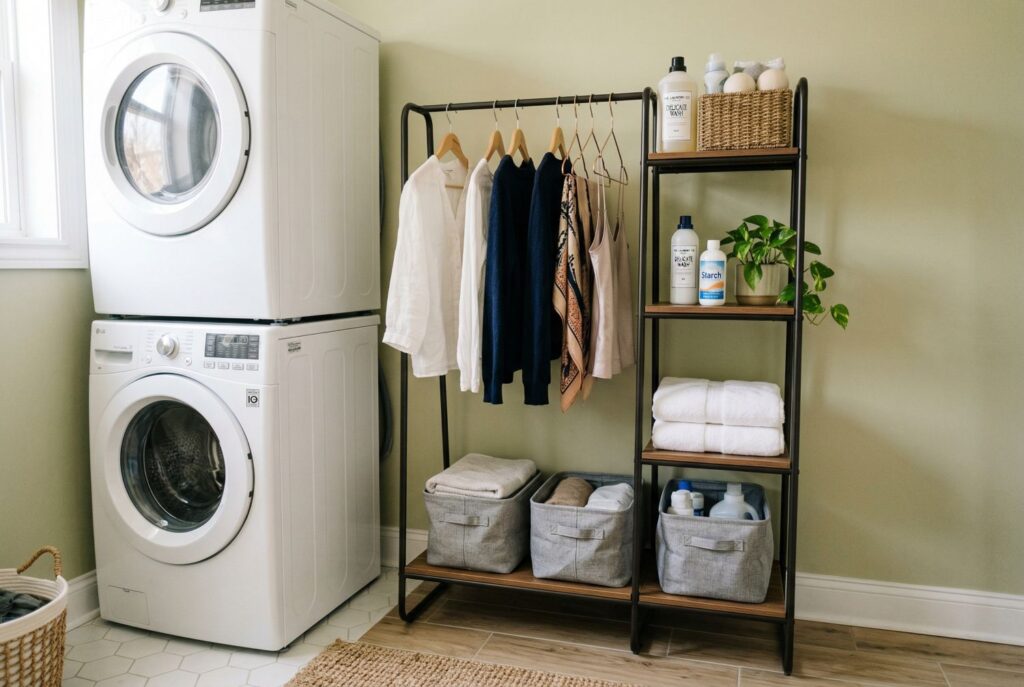 This solves two problems at once: drying and storage. It’s also renter friendly because it doesn’t require wall drilling or permanent changes. Place it near the machines or beside a wall, then use the hanging rod for delicates and the shelves for baskets, detergent, or folded towels. Among all small laundry room ideas, this one is especially useful because it adds function vertically without making the room feel boxed in.
