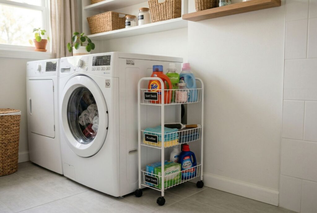 Most laundry rooms have an annoying narrow gap somewhere, usually between the washer and the wall or beside a cabinet. That little strip of wasted space is perfect for a slim rolling cart. This solves the problem of storing small items that otherwise end up scattered everywhere. A narrow cart can hold stain removers, dryer sheets, cleaning cloths, and extra supplies while staying easy to pull out when needed. It’s a simple fix, but it makes a tight room feel much more efficient.