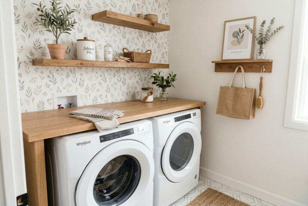 Not every upgrade has to be purely practical. Some of the best laundry room decor ideas are inexpensive visual changes that make the room feel more intentional. A peel and stick backsplash or wallpaper solves the problem of a room feeling unfinished or forgotten. It can brighten a dull corner, add personality, and make even basic shelves or machines look more styled. Choose something easy to wipe down and keep the pattern simple if the room is very small. You don’t need much material, which makes this a high-impact, low-cost improvement.