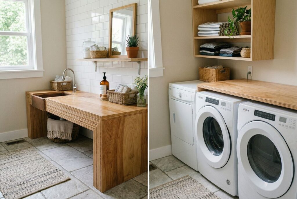 One of the most effective DIY small laundry room ideas is adding a countertop over front-loading machines. A sealed plywood slab instantly creates a folding zone without requiring new cabinetry or stone.
