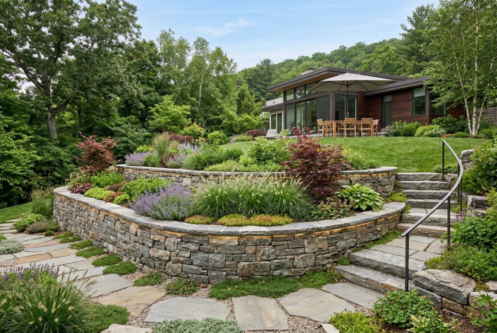 Using a natural stone retaining wall provides a timeless, rustic appearance that blends into the landscape.