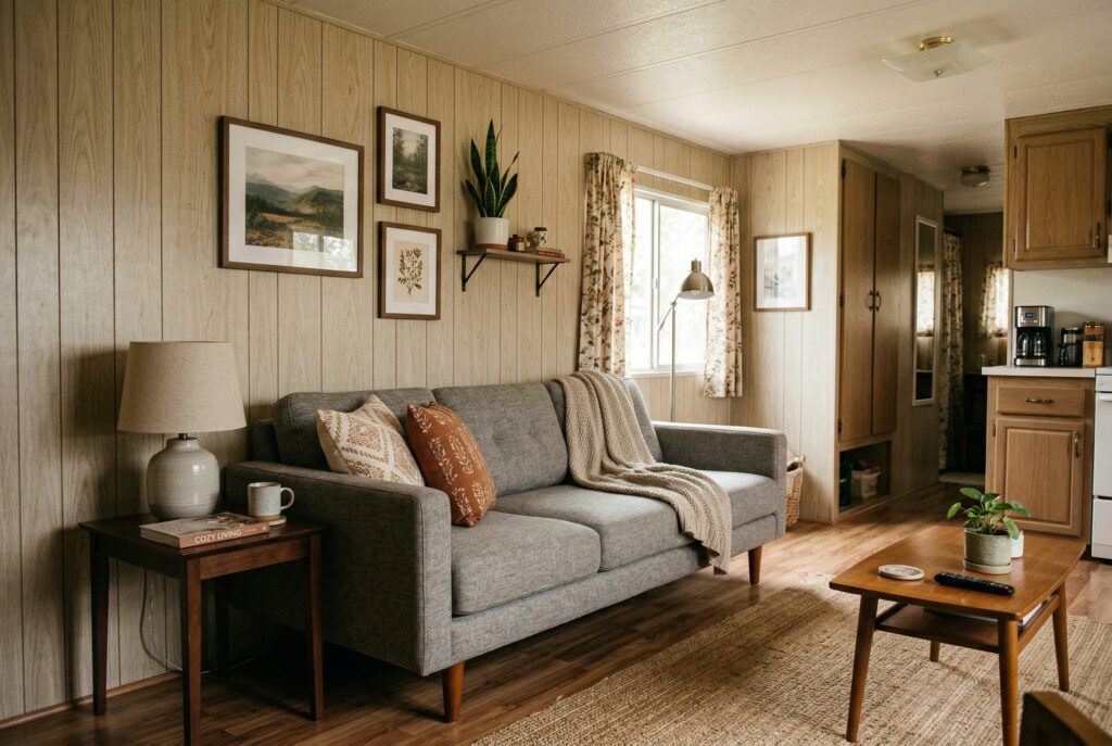 Choose a few meaningful pieces of art instead of filling every wall. Use textiles such as rugs, curtains, and pillows to bring in softness and color. Display favorite items in grouped arrangements rather than scattering them throughout the home. Plants can also help a mobile home feel fresher and more lived in, as long as they don’t compete for every available surface.