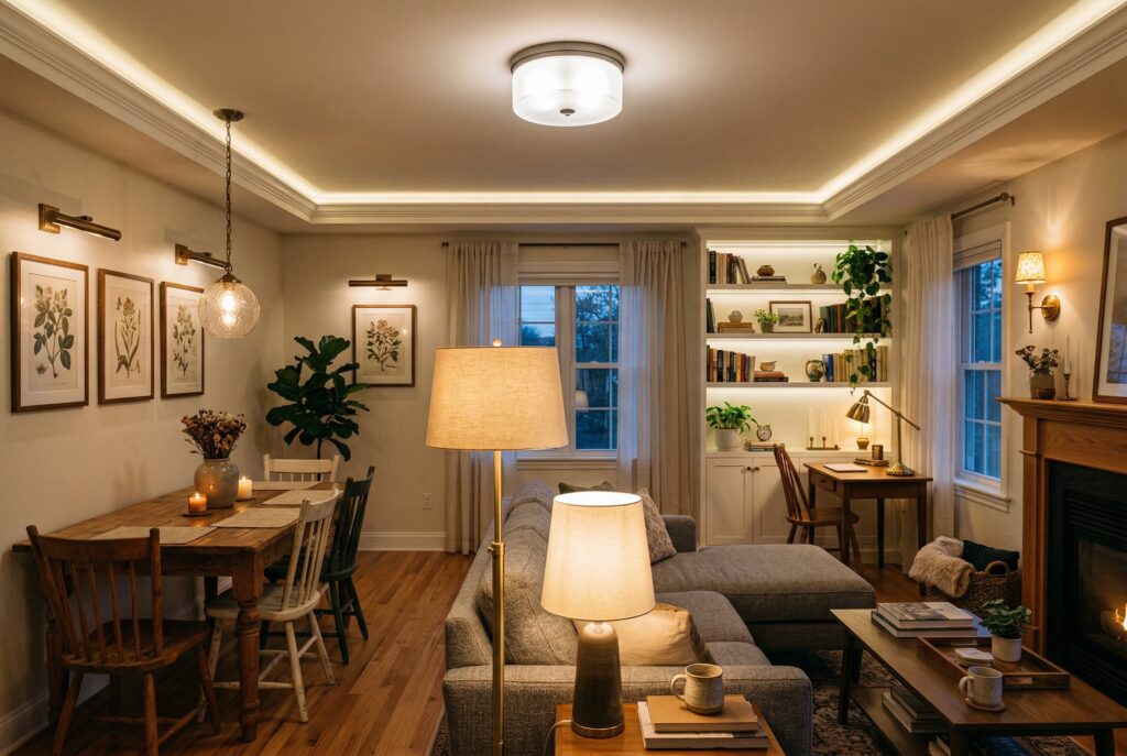 Lighting has a huge effect on whether a living room feels useful and inviting. In a multi-use space, one ceiling light usually isn’t enough. The room needs lighting that supports work tasks, reading, screen time, and winding down in the evening.