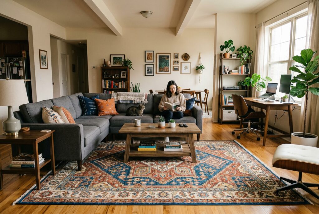 This doesn’t require walls or dramatic dividers. Often, the arrangement of the furniture does the work. A sofa and rug can anchor the relaxation zone, while a small desk, compact table, or accent chair near a window can define a more productive area. The goal is to make each activity feel intentional rather than having everything happen in one visually messy zone.