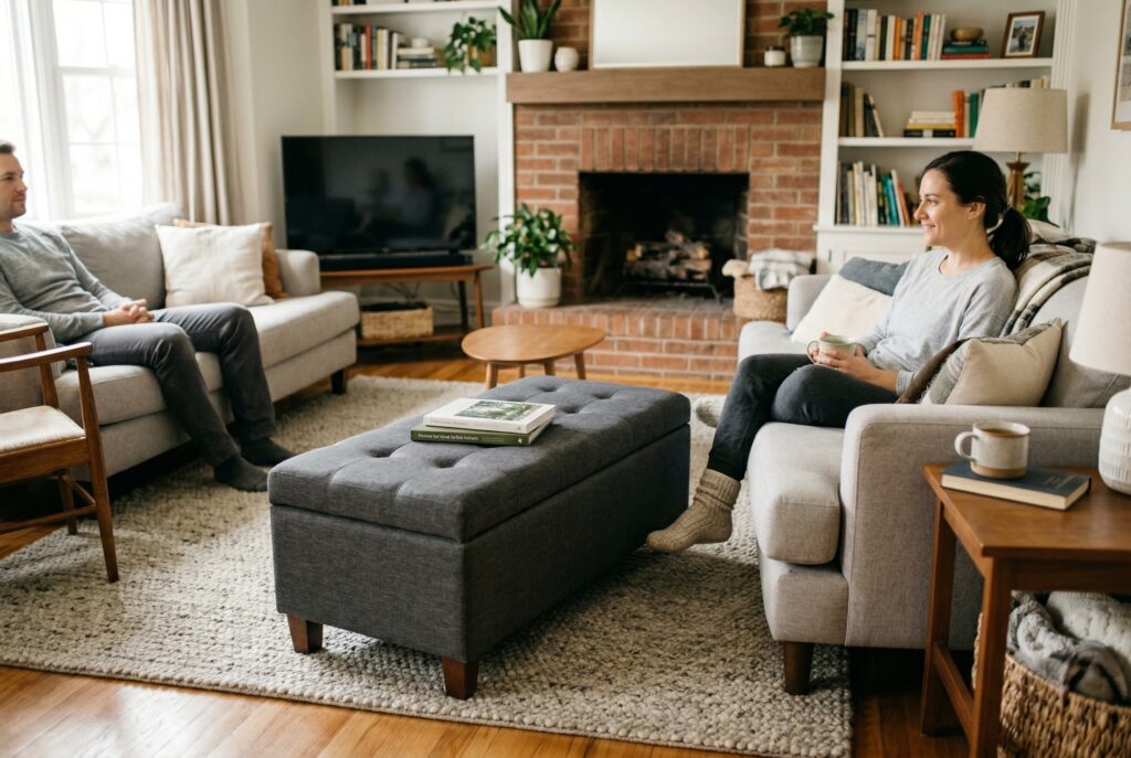 One of the easiest ways to create a more functional living room is to start with furniture that serves multiple purposes. A storage ottoman can work as a footrest, extra seating, and a place to tuck away blankets or games. A console table behind the sofa can double as a light work surface. Nesting tables can expand when needed and disappear when they aren’t.