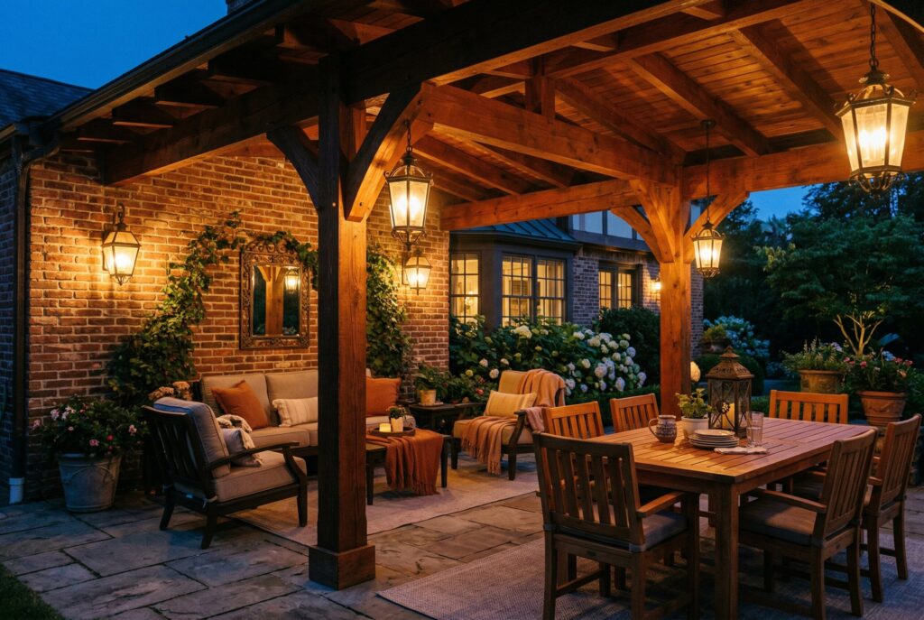 Teak, powder-coated metal, all-weather wicker, concrete, and performance fabrics are common choices because they’re durable and relatively easy to care for. Cushions should dry well and resist fading. Rugs should be rated for exterior use. Hardscaping materials should suit the local climate and the level of maintenance the homeowner is comfortable with.