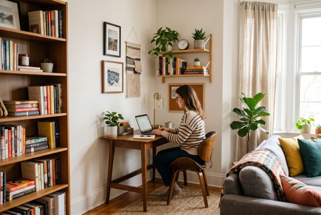 If a closet isn’t available, a living room nook can still become an effective office with a little zoning. A compact desk placed against an underused wall, window corner, or side of a bookcase can work surprisingly well if the area is visually anchored. One easy method is to use a rug to define the office footprint. Another is to soften the boundary with a linen curtain, screen, or tall plant so the desk feels like its own zone instead of random overflow furniture.