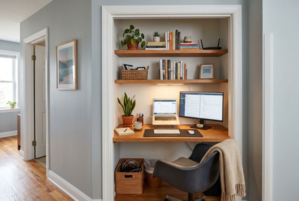A closet office, or cloffice, is one of the smartest options for small homes because it creates natural boundaries without demanding extra square footage. If you have a shallow closet in a guest room, hallway, or spare bedroom, removing the doors and installing a simple wood desktop can create an instant workstation. Add a floating shelf above the desk, tuck a slim task chair underneath, and the setup suddenly feels purposeful rather than improvised.