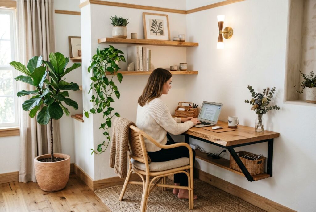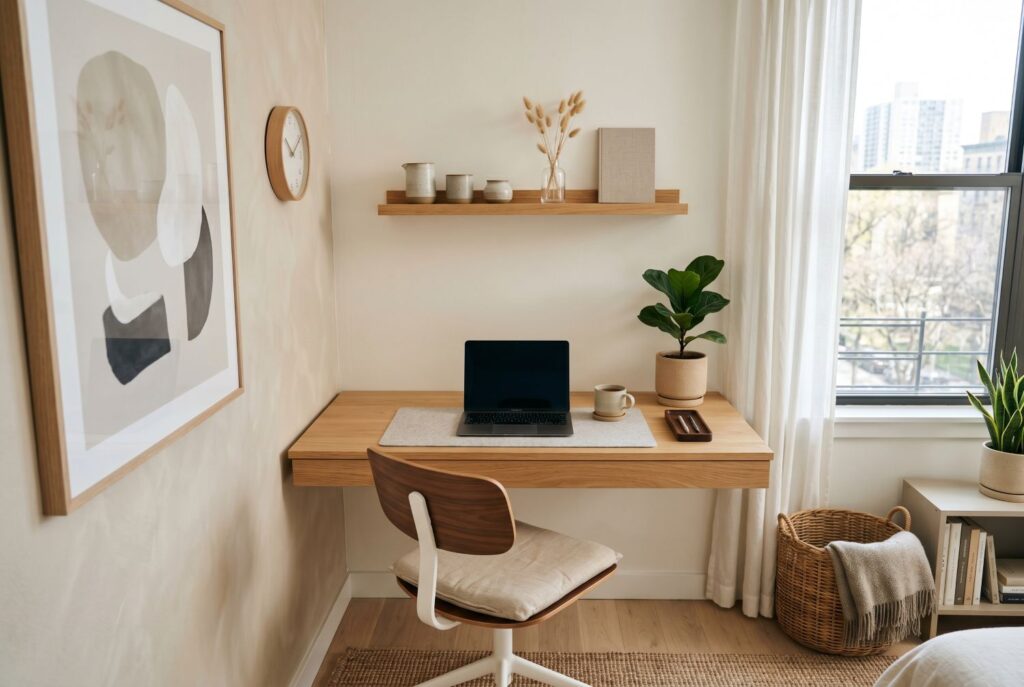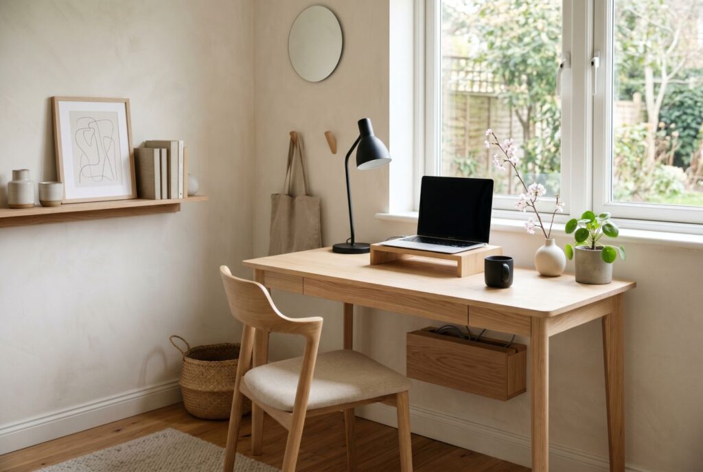 A Japandi-inspired workspace is one of the easiest ways to make a small office feel calm and elevated. Think pale oak or ash wood, a simple desk silhouette, matte black or soft bronze hardware, and almost no visual clutter. Hidden cable management matters a lot here. If cords spill everywhere, the entire effect disappears.