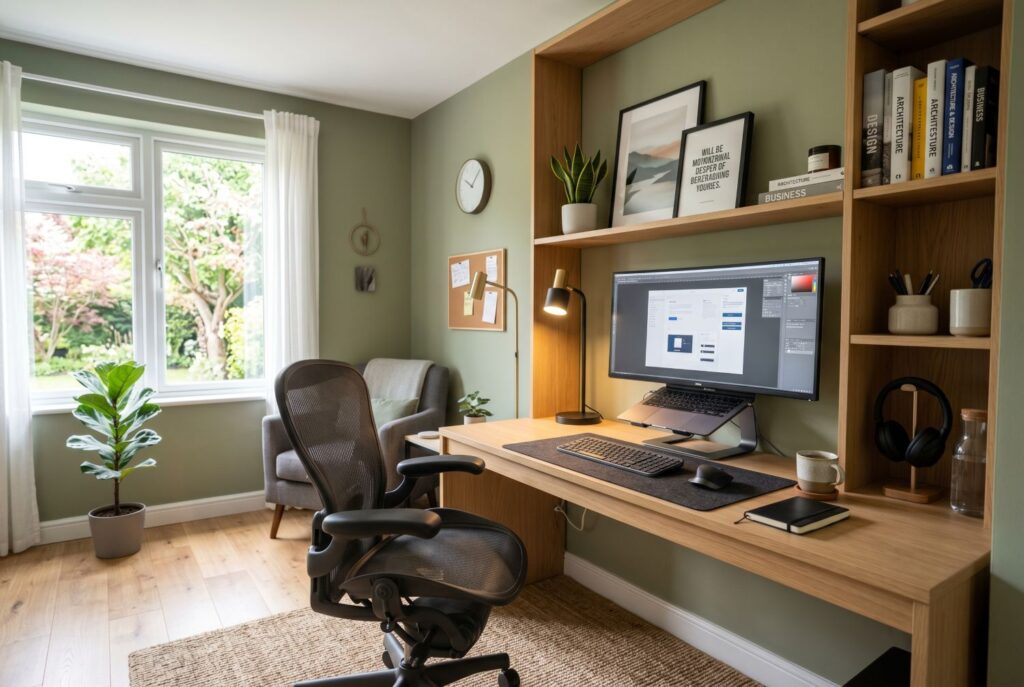 This is where home office design becomes less about architecture and more about visual boundaries. Even a small shift in placement can help the workspace feel deliberate. That matters because the brain responds differently to a designated work zone than to a laptop dropped anywhere there’s an empty chair.
