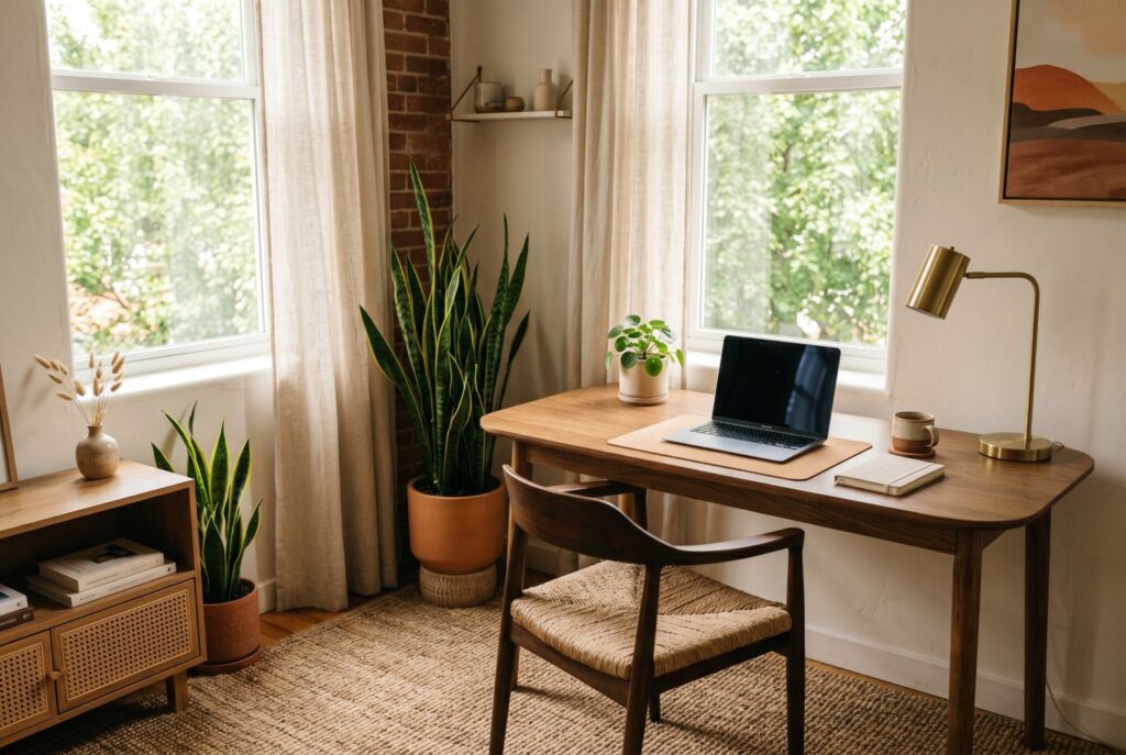 If you want something warmer, an organic modern corner can make a small office feel fresh without becoming busy. Use natural light as a design element wherever possible. Add one or two sculptural plants like a snake plant, choose a desk in a warm neutral finish, and bring in a soft texture through a woven chair cushion or natural fiber rug. Among modern home office ideas, this approach works especially well in apartments and shared spaces because it blends more easily with the rest of the home. It doesn’t scream “office.” It feels like part of a well-designed room.