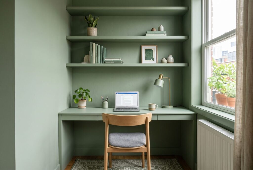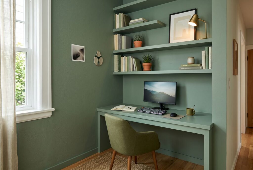 One of the smartest small-space tricks is color-drenching. Paint the wall, shelving, and even the desk in similar tones so the boundaries blur. When the desk doesn’t contrast sharply with the wall behind it, the office footprint feels quieter and less intrusive.