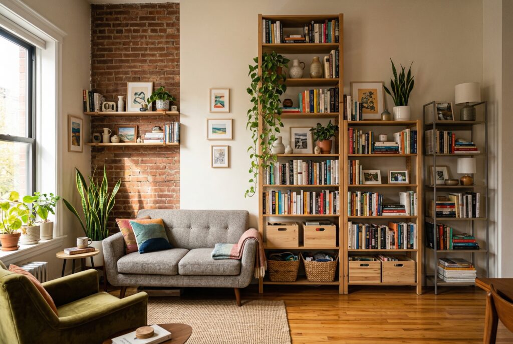 In any small room, floor space disappears quickly. That is why vertical storage is essential in smart small apartment living room ideas. Tall shelves, wall mounted storage, and vertical styling help keep a small living room layout open while still providing enough storage. This approach appears consistently in successful small living room ideas because it balances function and visual space.