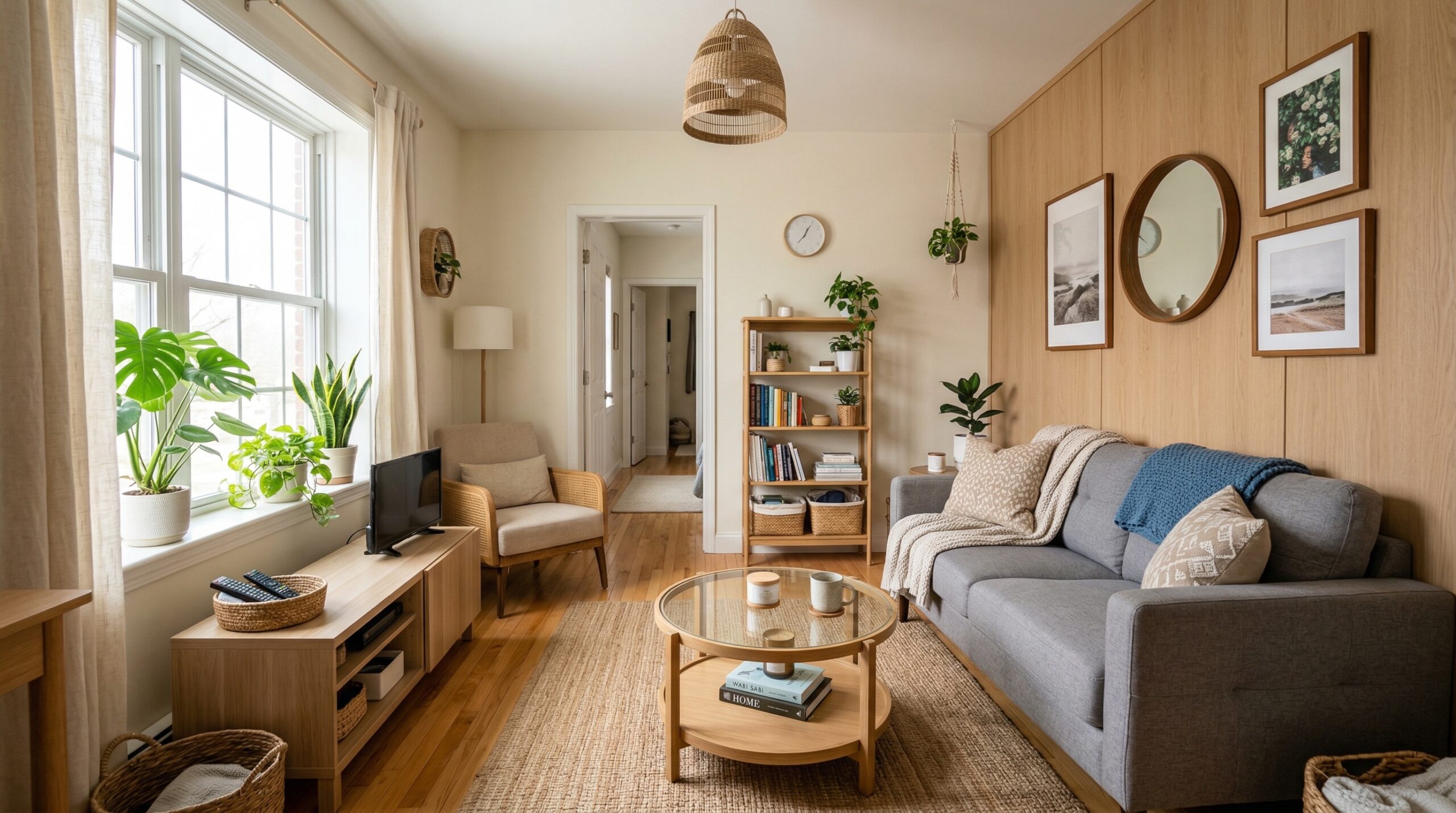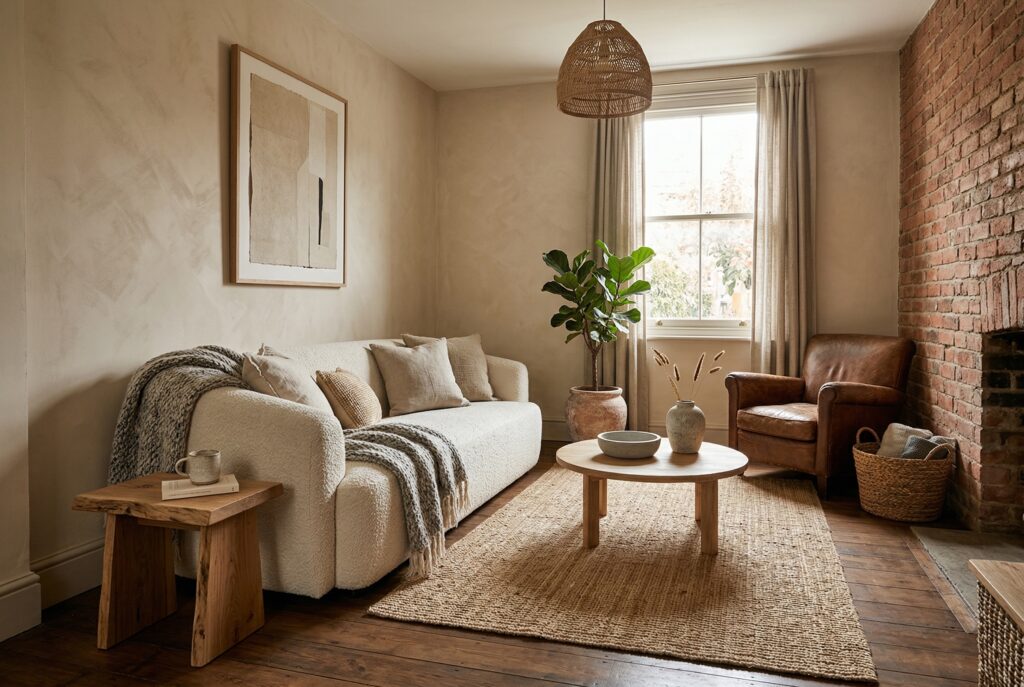 Across many small living room ideas, there is a clear shift toward spaces that feel collected over time. Natural materials, warm wood tones, and layered lighting create depth without overwhelming a small room. These living room decorating ideas work especially well in compact spaces because they add interest without adding clutter.