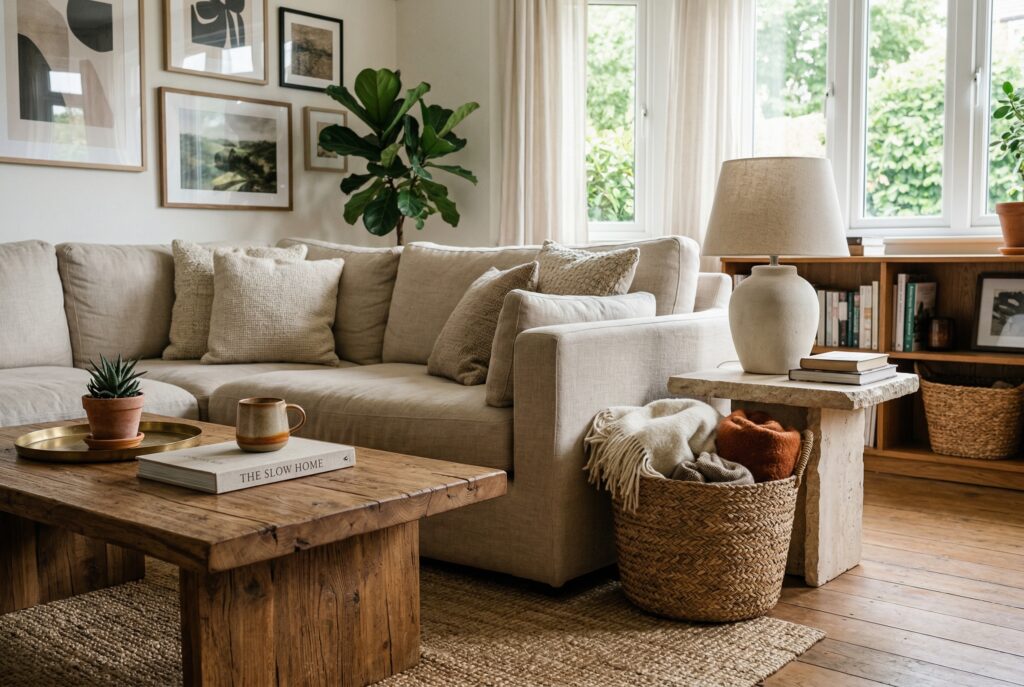 A living room might include a wood coffee table with visible grain, a woven basket near the sofa, a ceramic lamp with a matte finish, or a side table with a slightly imperfect stone surface. These details may seem small, but together they make the room feel layered and grounded.