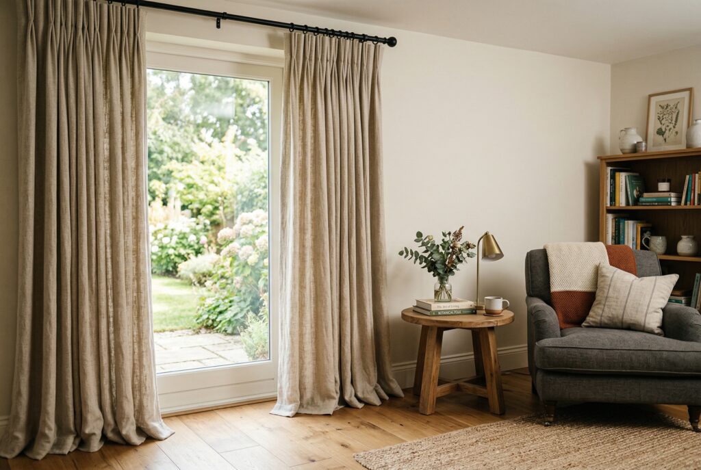 Linen-look curtains, cotton blends, woven shades, or layered drapery can all add depth. Even when the color is neutral, the material itself changes how the room feels. A soft, lightly textured curtain can make daylight feel gentler and the whole room seem calmer. This idea works especially well in living rooms with large windows or open layouts that can feel visually exposed. Texture at the windows helps balance the room. It can also make the ceiling feel taller when curtains are hung properly. Beyond function, fabric around the windows adds an element of comfort that many living rooms quietly need.