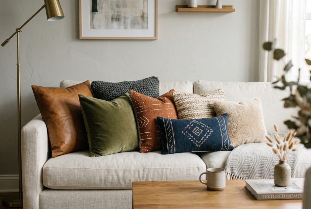 Throw pillows are often the first thing people think of when they want to add texture, but the real impact comes from material contrast, not simply adding more pillows. A set of pillows in the same fabric but different colors won’t create the same depth as a thoughtful mix of linen, boucle, velvet, cotton slub, or chunky woven covers.