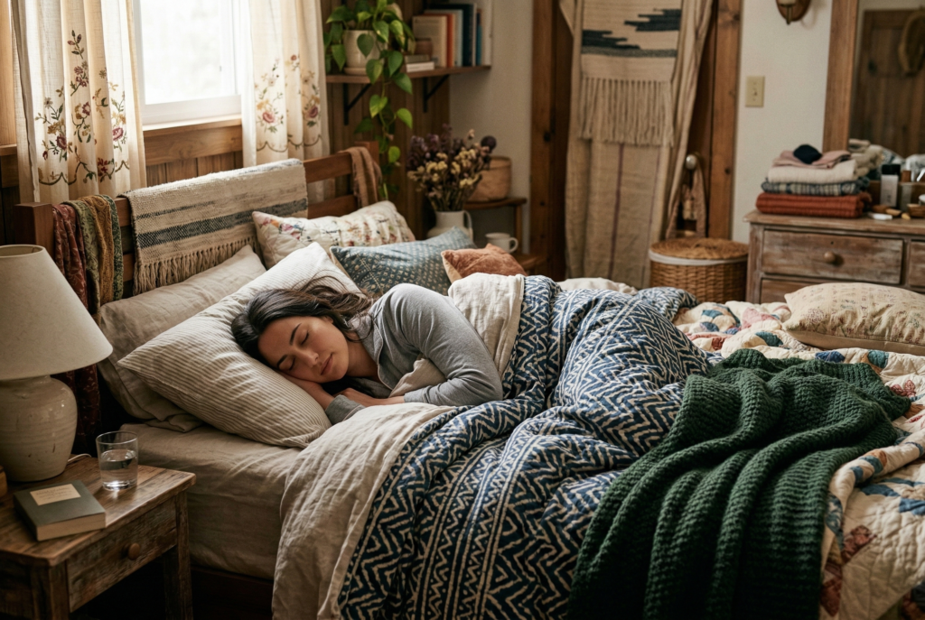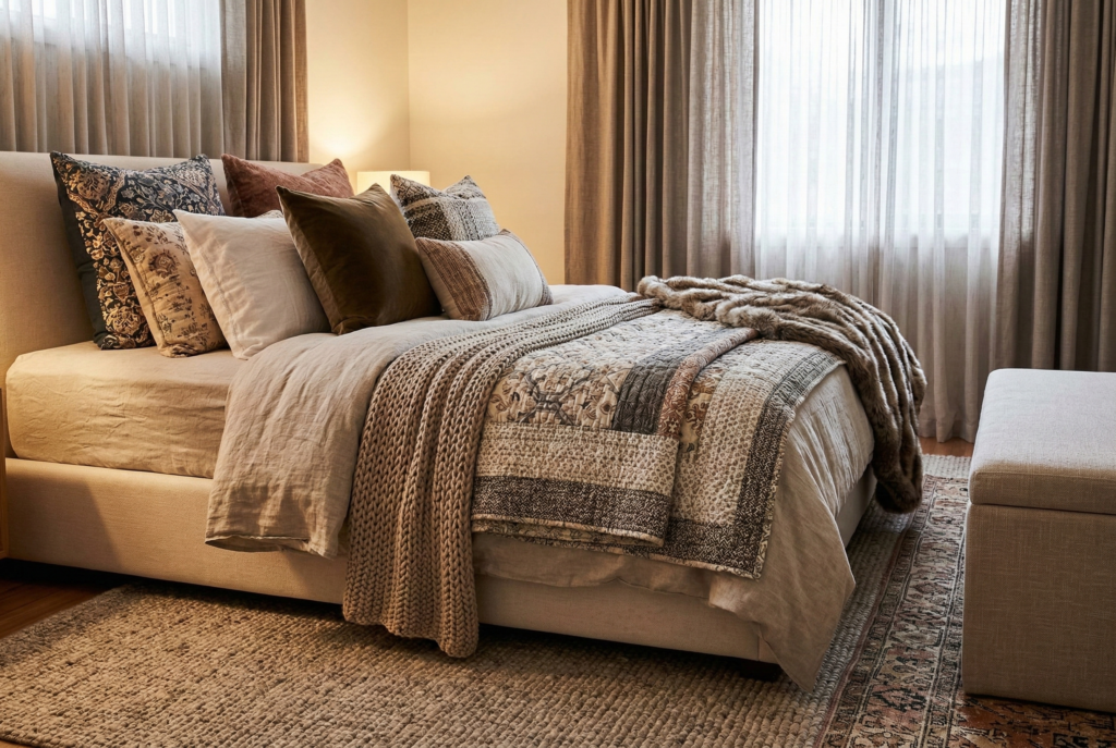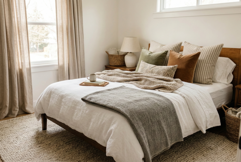 This is where a room starts to feel lived in rather than staged. Think woven throws, a bench cushion, Roman shades, or a quilt folded at the foot of the bed. The middle layer often adds the “cozy” feeling people say they want but don’t always know how to create.