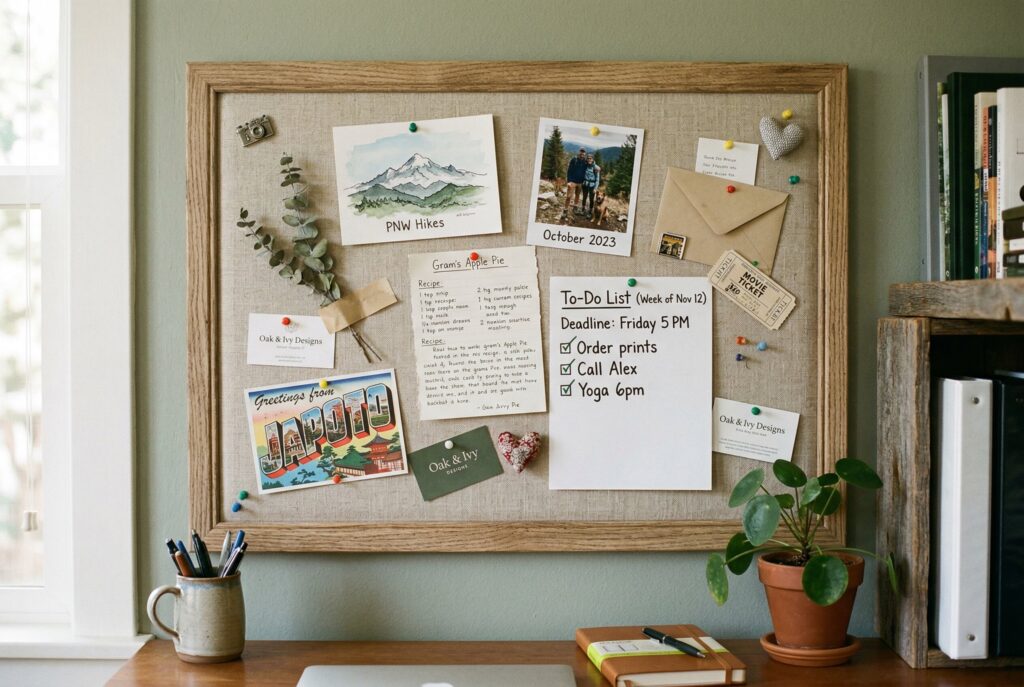 A pinboard or fabric bulletin board is another smart option, especially for people who like to keep reminders, project notes, or inspiring images visible. This is where style and function can meet. A neatly framed board in linen, cork, or a neutral tone feels far more elevated than random papers taped to the wall.