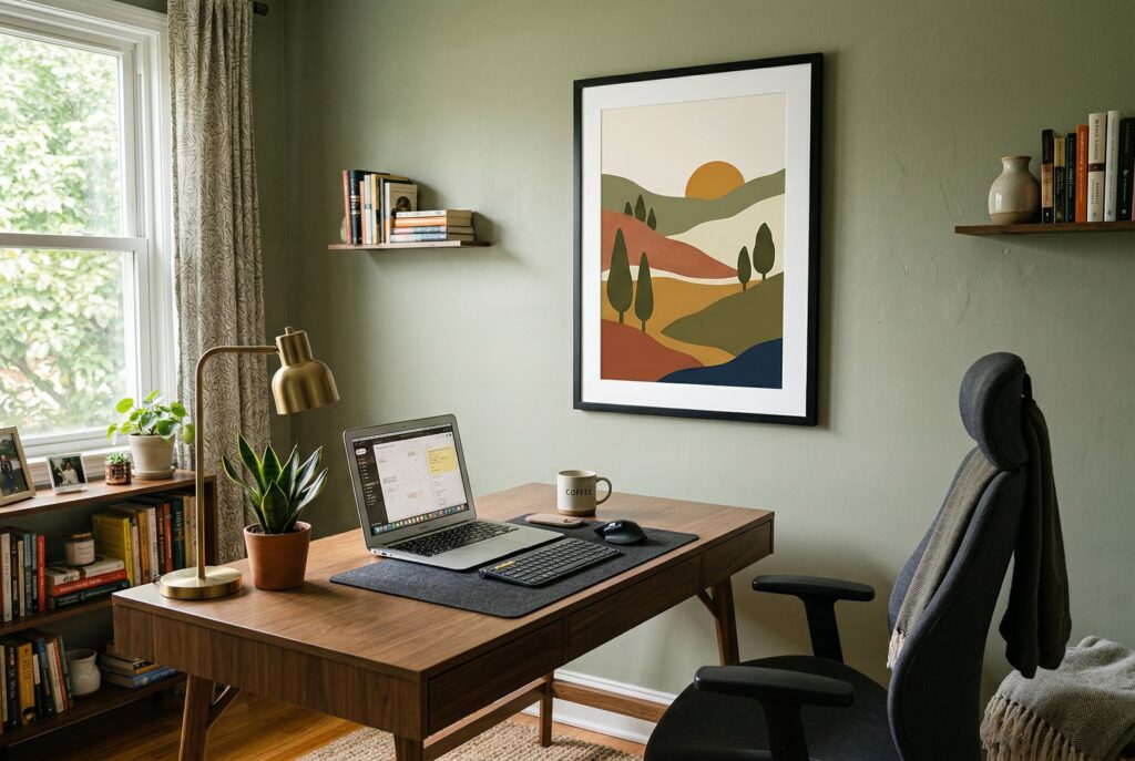 One of the easiest ways to get there is by choosing a restrained palette. Soft whites, warm beige, muted green, dusty blue, and natural wood tones work especially well because they create a calm foundation. They also leave room for layered home office decor and subtle office decorations without making the space feel busy.