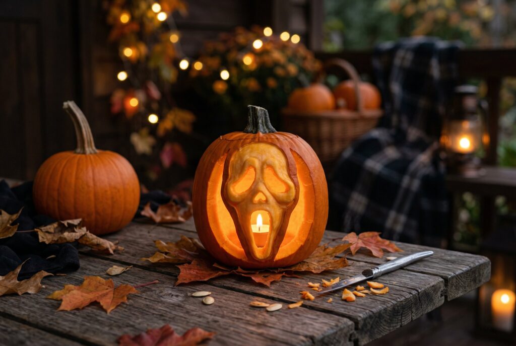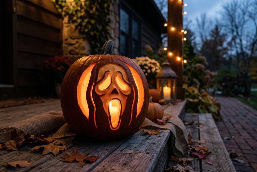 The 90s nostalgia trend isn’t just a phase; it has officially taken over Halloween for the foreseeable future. Thanks to the recent “Scream” movies, the Ghostface mask has become the undisputed king of the porch. The beauty of this design is that it’s instantly recognizable even if your carving skills are a little shaky.