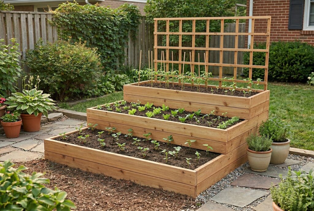 For those with a little more space, tiered raised garden beds are an excellent option. These beds allow you to create multiple planting levels, which helps you maximize the growing space. You can start with a small 3-tier raised bed design to grow everything from vegetables to flowers. By creating multiple layers, you create more space for planting while still keeping the structure compact.