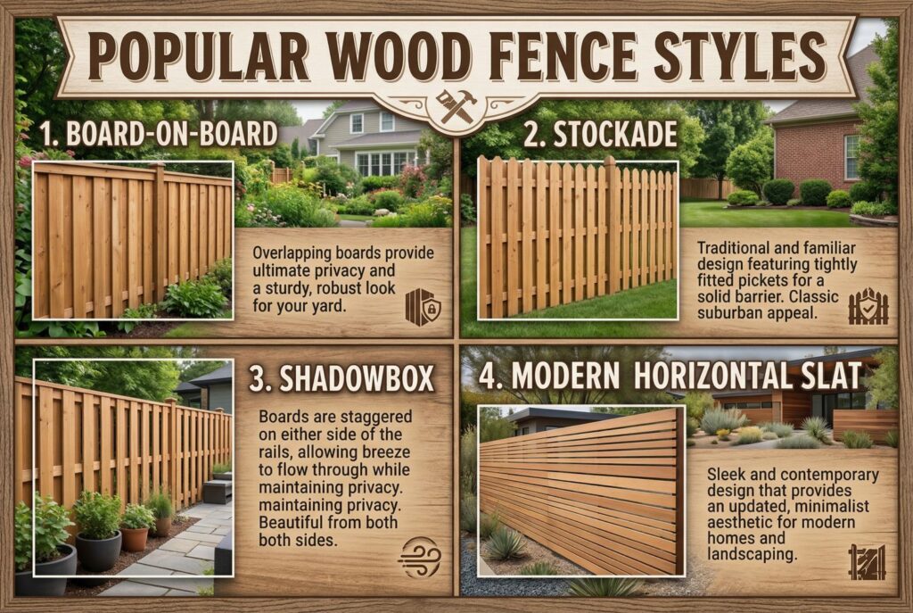 One of the biggest reasons homeowners prefer wood is the variety of design options. Board-on-board fences are excellent for strong privacy because overlapping boards reduce visible gaps. Stockade fences create a more classic solid barrier and are a familiar choice for many suburban yards. Shadowbox designs are useful when you want some airflow without giving up too much coverage.