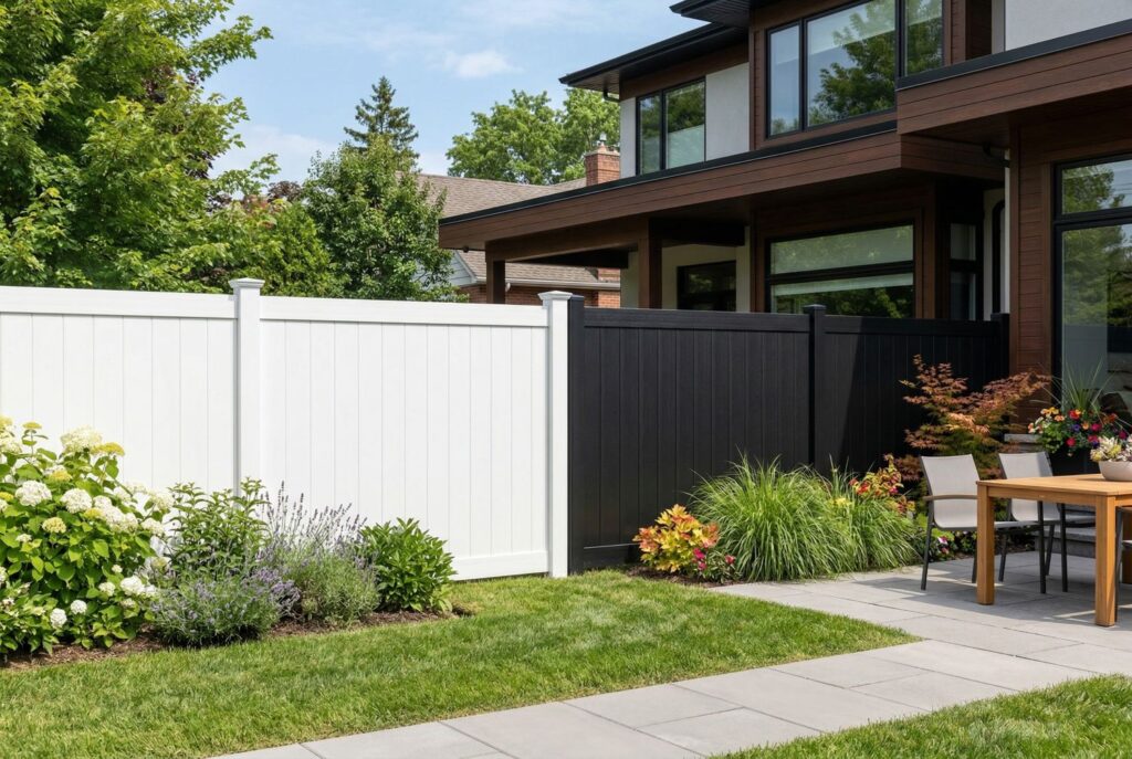 A black vinyl fence can feel more modern and dramatic, especially around contemporary homes or dark-trim exteriors. Some products also imitate stone textures or wood-grain finishes, giving buyers a middle ground between synthetic durability and a more natural look. That variety makes vinyl fencing more flexible than many homeowners assume at first.