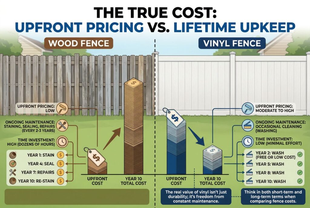 The biggest mistake buyers make is only comparing the initial quote. Yes, a wood fence often starts out cheaper. Yes, a vinyl fence cost estimate is often higher. But the smarter question is what the fence will cost you over time.
