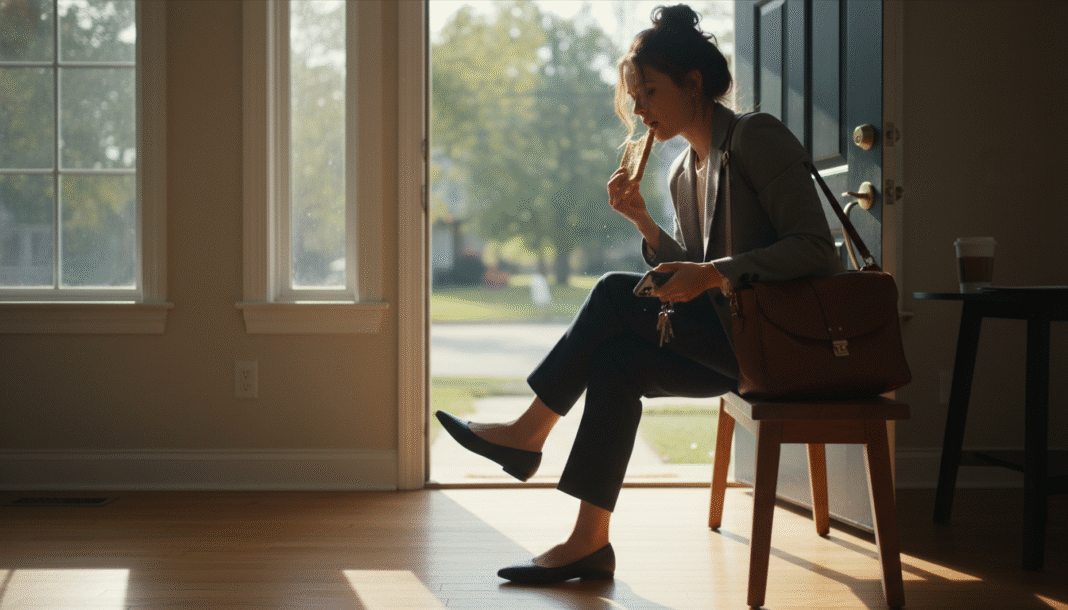 - Grab essentials like keys, wallet, or work bag
