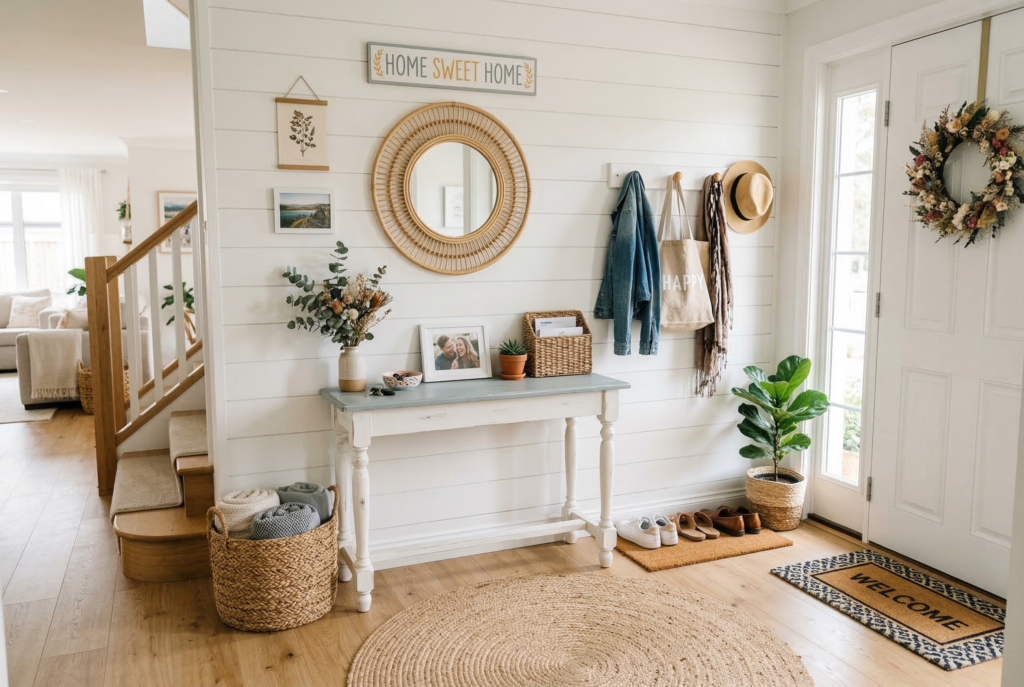 If space is limited, consider investing in a bench with storage or a slim console table that can hold keys, mail, and small items. A functional entryway piece helps minimize clutter and creates a tidy, organized space to start and end your day.