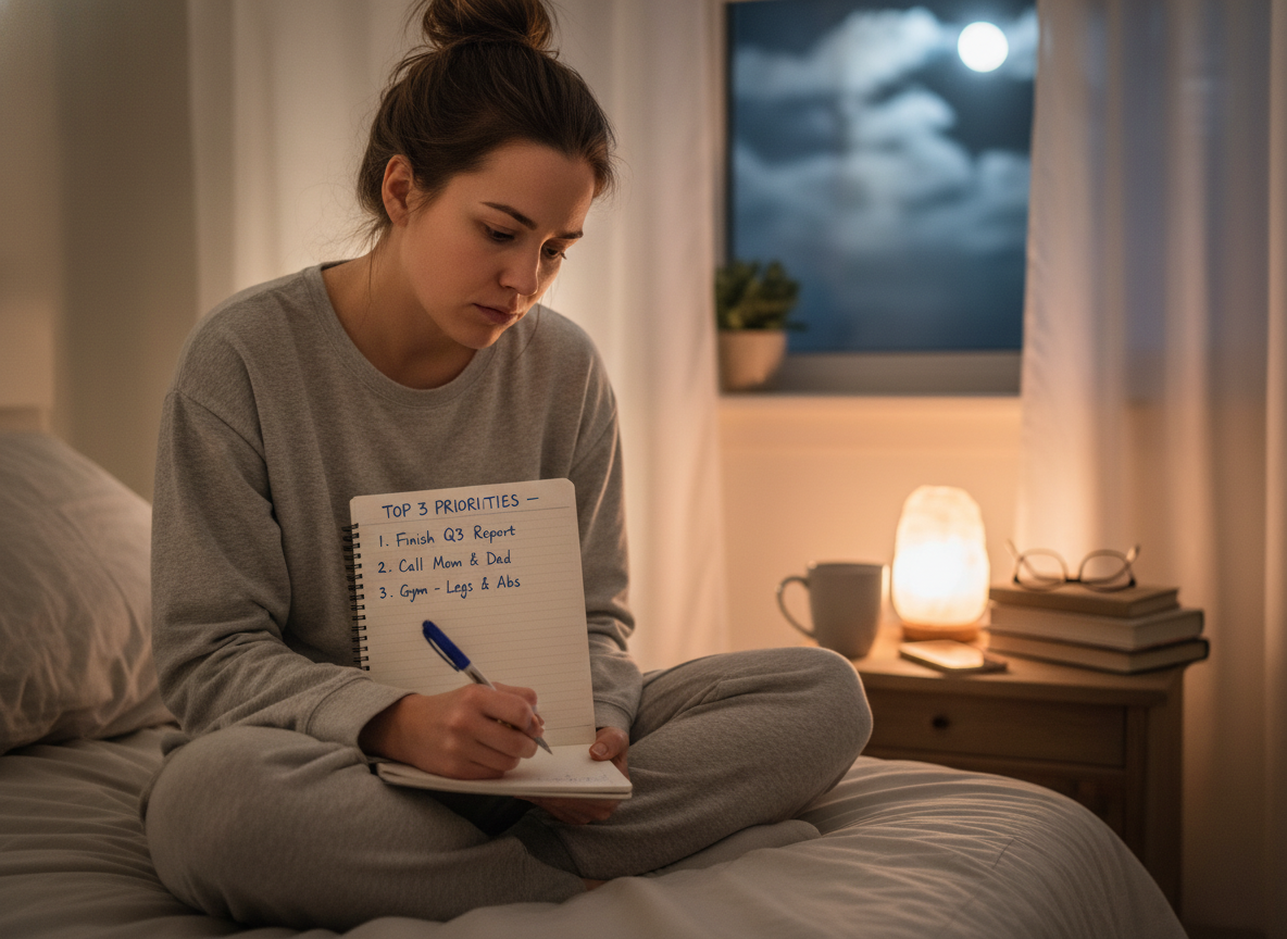 A few minutes of preparation can dramatically reduce nighttime anxiety. It can be laying out clothes, packing a bag, or even writing down tomorrow’s top priority. Just keep it brief, and do it before you’re fully in sleep mode so your mind has time to power down afterward.