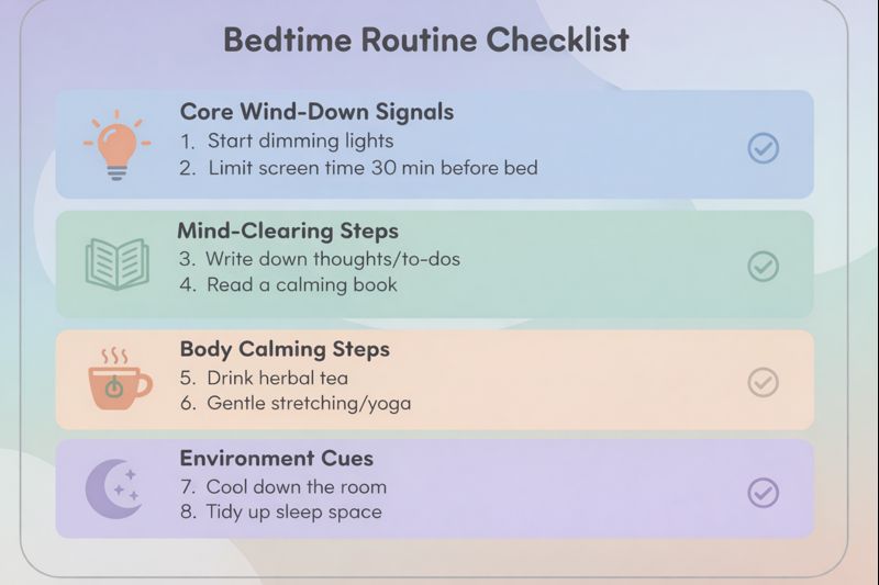 A realistic routine takes five to fifteen minutes. It also has a minimum version for nights when you’re drained. On good days, you might add reading or stretching. On rough days, brushing your teeth, writing one sentence, and taking a few slow breaths still counts. Consistency comes from doing something, not everything.