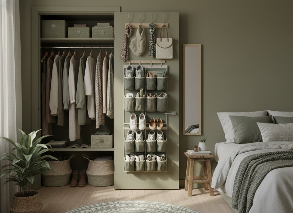 Consider adding over-the-door organizers for shoes, scarves, or accessories. These organizers can hold multiple items, keeping them accessible without taking up additional space in your closet. You can also install hooks on the back of the door to hang hats, bags, or coats.