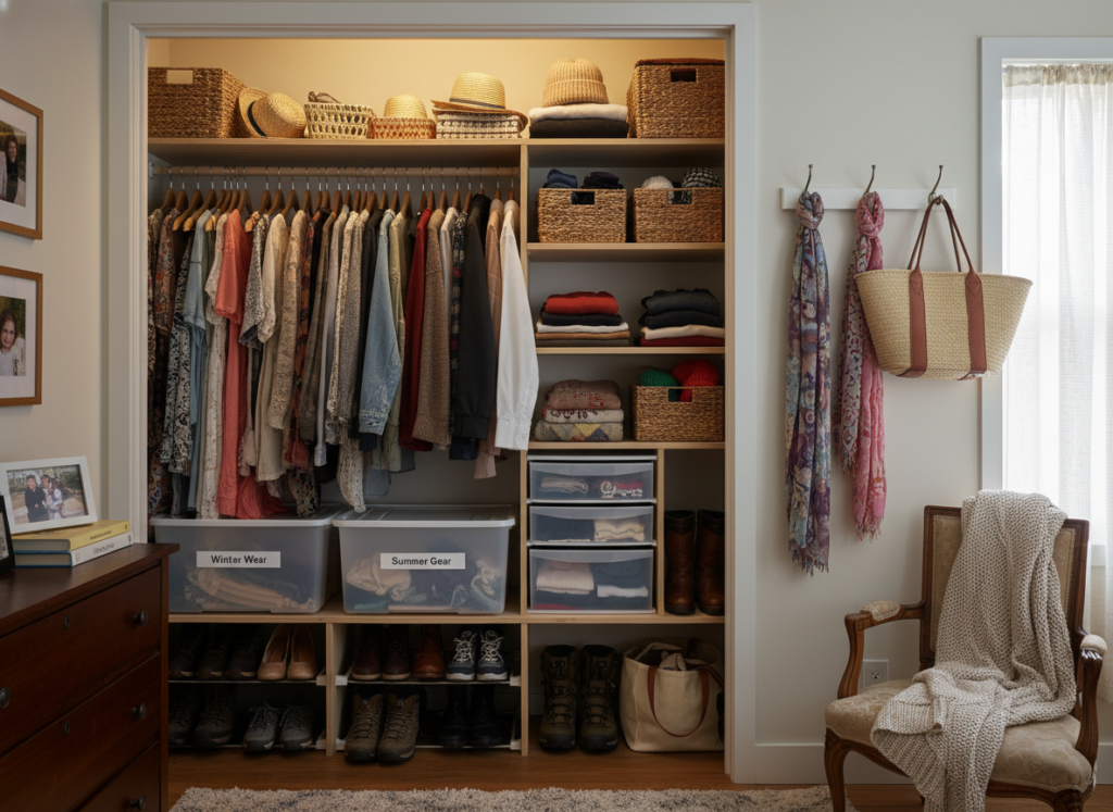 When labeling, consider marking the contents and the date they were stored. This will help you keep track of older items and rotate them to the front for use. For example, label storage bins for scarves, seasonal clothes, or accessories so you can find what you need without opening every container.
