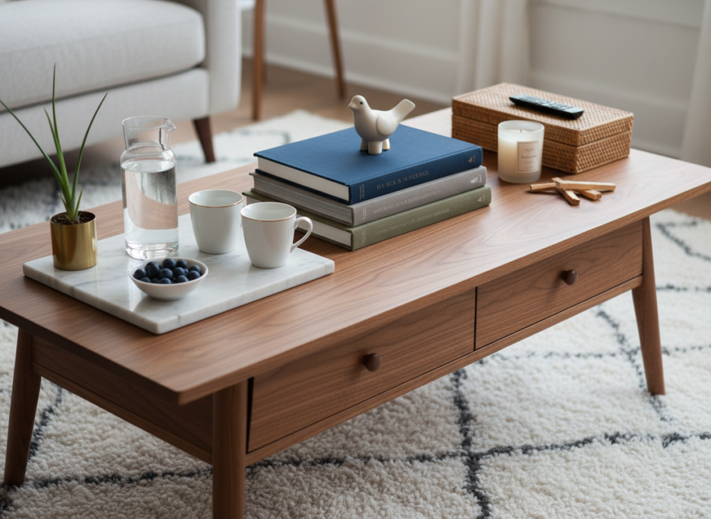 You can group items by functionality or style. For example, placing all your coffee table books in one section or stacking decorative trays together to create an elegant look. Categorizing items prevents visual clutter and allows you to access them easily when needed.