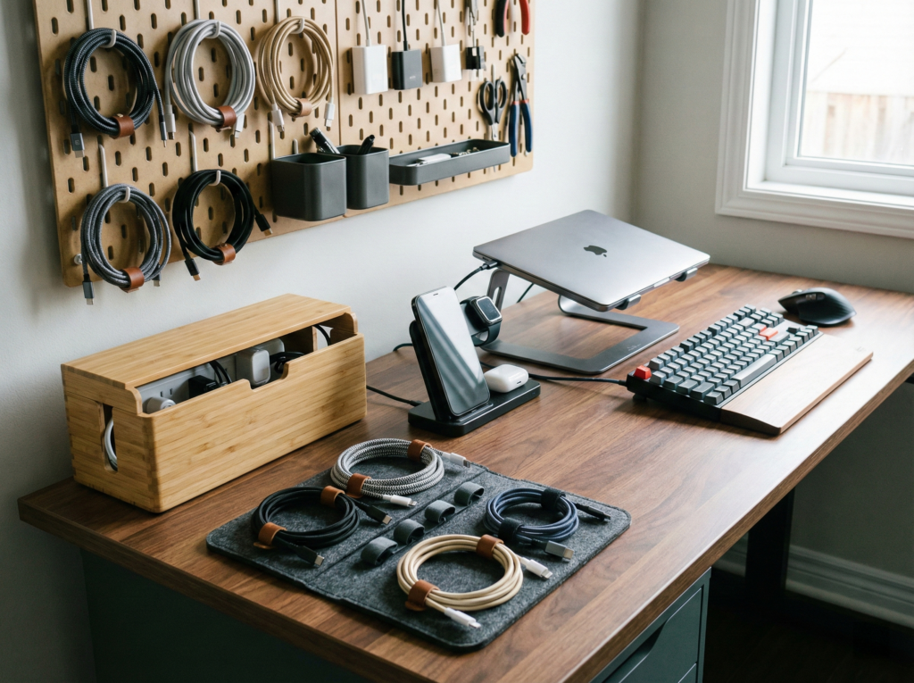 Cables, chargers, and electronics tend to create chaos on any desk. A tangled mess of wires can make it difficult to focus and adds to the overall visual clutter. To solve this, invest in cable management solutions to keep wires neatly bundled and out of sight.