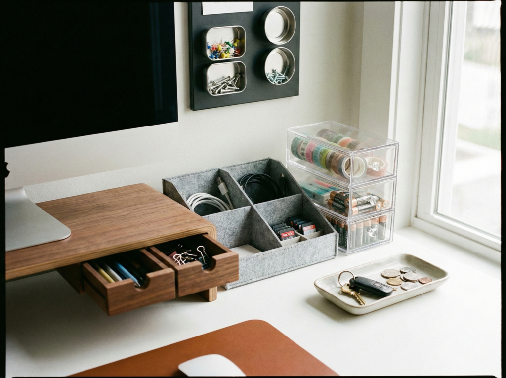 For those smaller items that tend to pile up, such as receipts, pens, and post-its, use small storage solutions to keep them organized and out of the way. Drawer dividers can help you separate office supplies in your desk drawers, while small trays or baskets can hold frequently used items and keep them easily accessible. For items like USB drives, pens, or highlighters, use small storage containers or organizer trays that fit neatly into your drawer or sit on top of your desk. Keep these items in a dedicated area to avoid scattering them around your workspace.
