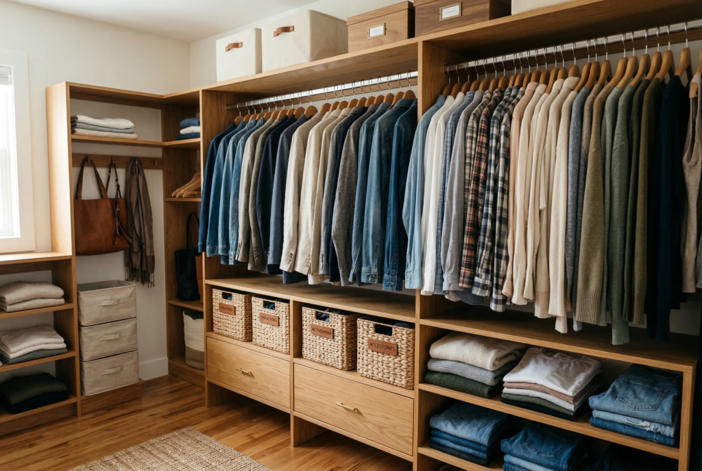 Wooden hangers help create a more uniform closet and tend to last longer than thin plastic or wire options. Pair them with fabric bins, shelf baskets, and a small number of practical dividers to keep categories clear. The goal is to create a closet that feels easier to use, not one packed with gadgets.
